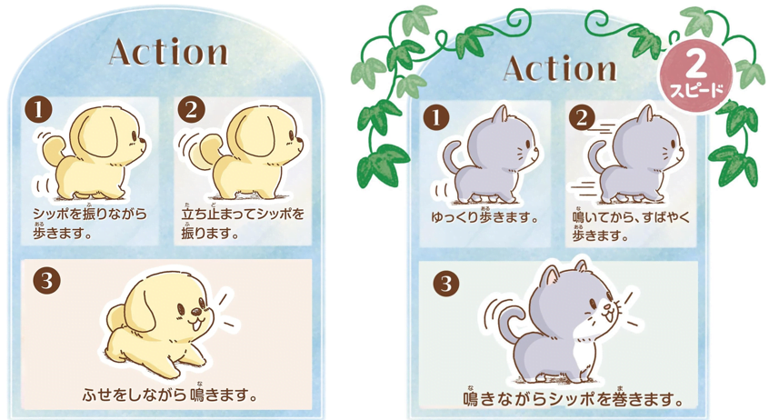 - ワンちゃん: 尻尾を振りながら前進 → 止まって尻尾フリフリ → 鳴き声と共に伏せ