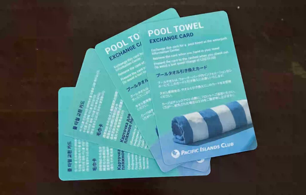 タオルカードを無くすと、チェックアウト時に1枚10ドル請求されます。